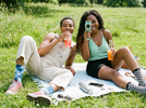 cinematic video of three friends enjoying a slow, sunny picnic in a green field by a lake. the camera starts close on a young woman in a light brown shirt and shorts sitting on the grass, laughing as she slowly pops a strawberry into her mouth, sunlight on her face and her smartwatch catching the light. in the background, one friend in a beige top chats and gestures while sitting on the picnic blanket, and another in a light blue top lounges and stretches happily on the blanket. gentle breeze moving their hair and the grass, snacks on the blanket, soft handheld camera moves and relaxed pacing, no text or logos.